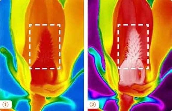 1.熱靈敏度決定熱像儀區(qū)分細做溫差的能力。同樣情況圖2所用熱像儀的熱靈敏度更低,畫面清晰顯示花蕊細節(jié)的溫度分布,而圖1同區(qū)域只能看到一片紅色。