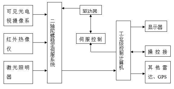 光電指向器采用球形結(jié)構(gòu),具有風(fēng)阻小,抗風(fēng)能力強(qiáng)的優(yōu)點(diǎn);采用陀螺穩(wěn)定系統(tǒng)能夠有效地隔離因強(qiáng)風(fēng)造成的安裝平臺搖擺,從而保持光電攝像系統(tǒng)的穩(wěn)定,得到清晰、穩(wěn)定的圖像,而且保證目標(biāo)圖像始終在電視屏幕上而不丟失。