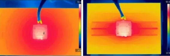 ?左圖:熱源和傳統(tǒng)散熱片直接接觸,散熱片溫度呈現(xiàn)明顯的熱梯度分布;