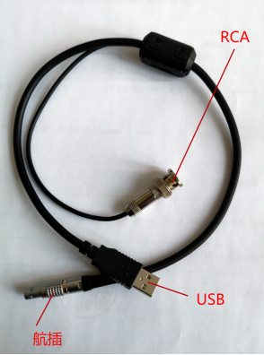 如圖所示,航插接口與設(shè)備相連,數(shù)據(jù)連接線上有2個功能接口,分別為USB接口,模擬視頻接口。