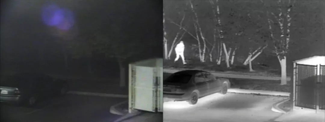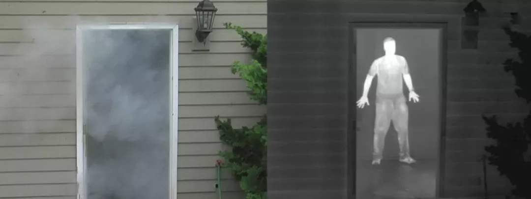 門口的人在可見光光譜中被煙霧遮住,但很容易被熱成像探測到