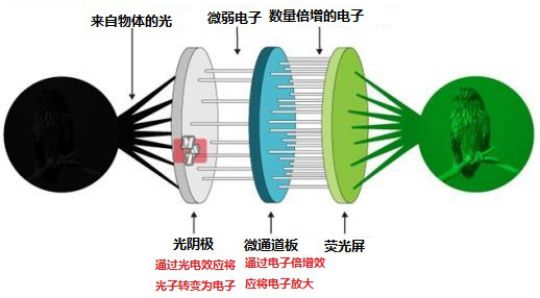 第一步:夜視儀物鏡將物體反射過來微弱光信號引進系統(tǒng),微弱光射在光電陰極上,即多堿光陰極(Sb-K-Na-Cs光陰極),在其作用下通過透射發(fā)射出微弱的光電子。