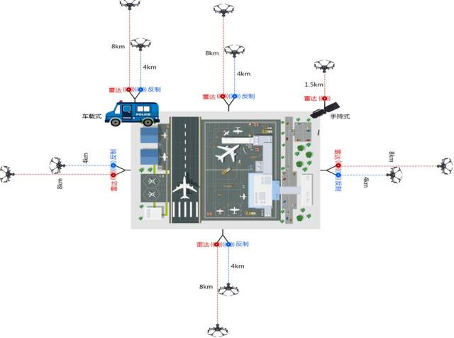 該系統(tǒng)通過集成雷達偵測、反制干擾、光電監(jiān)視、各種傳感器、效應(yīng)器和機電定位系統(tǒng),采用分階段、受控的方式,對惡意使用的無人機進行干擾,并迫使其降落。能夠?qū)?千米范圍內(nèi)的無人機進行探測、跟蹤、識別、干擾和制止。