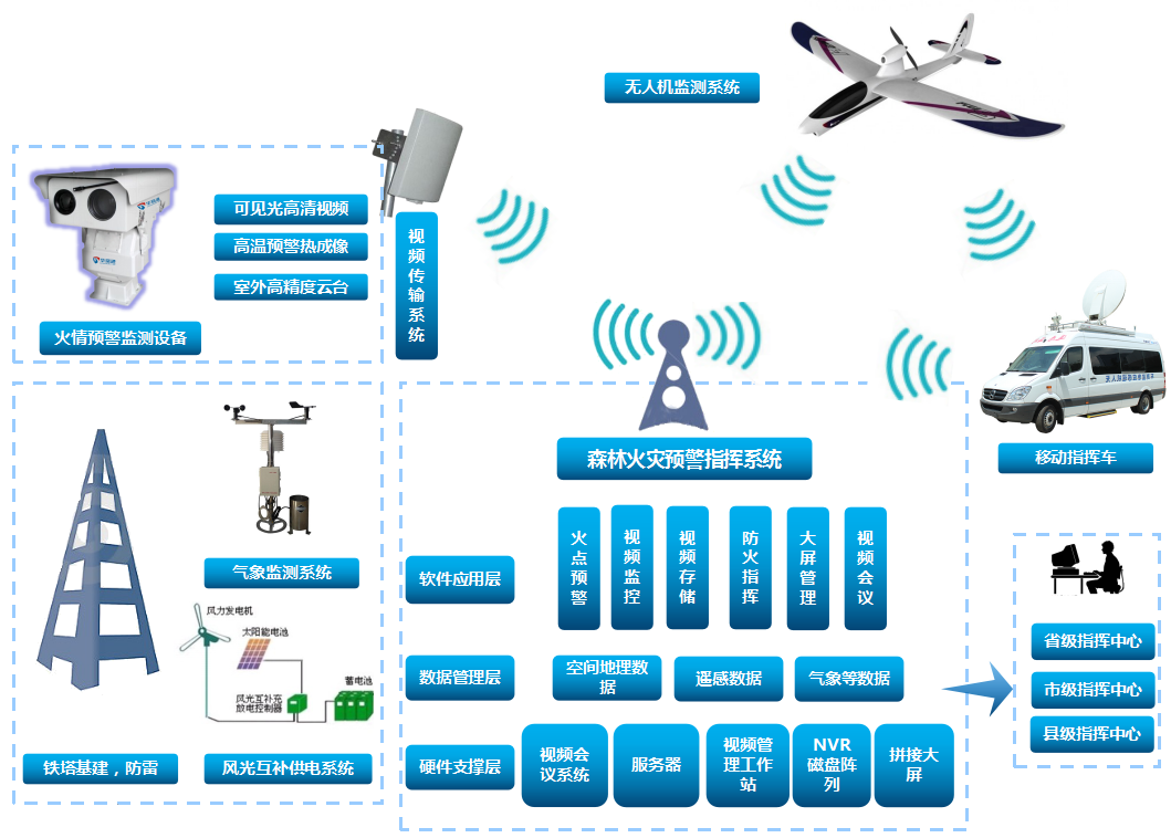 視頻監(jiān)控技術(shù)采用攝像機(jī)作為視頻圖像傳感器,用于采集監(jiān)控現(xiàn)場(chǎng)的信息;無線視頻監(jiān)控終端作為視頻采集、視頻疊加、語音及對(duì)講、報(bào)警、GPS定位、抓拍、云臺(tái)控制、硬盤存儲(chǔ)、SD卡存儲(chǔ)及遠(yuǎn)程視頻回放等。視頻監(jiān)控為森林防火提供了數(shù)字化和網(wǎng)絡(luò)化的管理,系統(tǒng)具有林火自動(dòng)識(shí)別功能,實(shí)現(xiàn)火情自動(dòng)報(bào)警,林火火點(diǎn)電子地圖精確定位,通過專線傳回縣森林消防指揮中心,由縣森防指統(tǒng)一指揮,實(shí)時(shí)監(jiān)控,實(shí)時(shí)預(yù)警,實(shí)時(shí)調(diào)度,做到森林火情早發(fā)現(xiàn)、早處置、早撲救,以確保全縣森林資源安全。