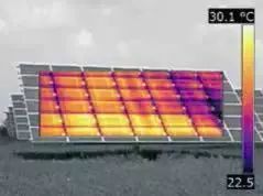 隨著溫度的升高,太陽能電池板的效率會降低,發(fā)電量減少。有些缺陷會導(dǎo)致它們發(fā)生故障,甚至產(chǎn)生逆向電流,損壞整個太陽能裝置。熱像儀可從遠(yuǎn)距離探測到電池板上的熱點,這使得缺陷查找大為簡化,防止缺陷變成毀滅性故障。