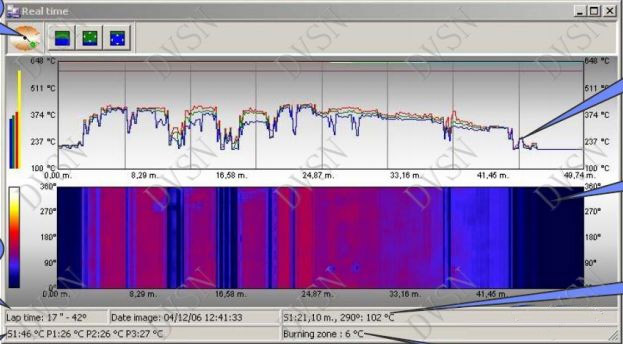 在實(shí)時(shí)畫(huà)面中查看爐窯各個(gè)區(qū)域最高溫度值、最低溫度值與平均溫度值,并能分析定位轉(zhuǎn)窯內(nèi)部結(jié)焦或耐火泥、耐火磚脫落位置與狀態(tài);