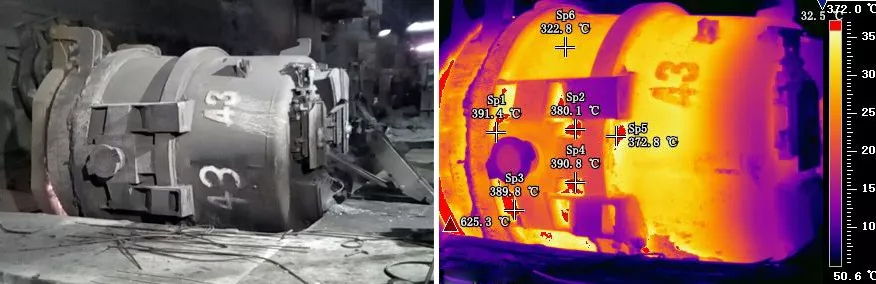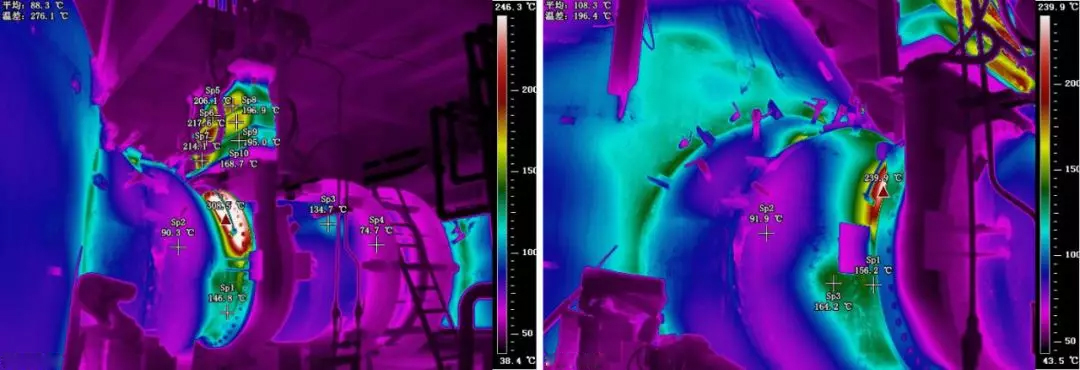 使用熱像儀來檢測(cè),直觀顯示鋼包表面溫度分布情況,哪里有缺陷一目了然。如下方熱像圖,圖上Sp1、Sp2兩處溫度均超過380℃,表明這兩處鋼包壁殘厚變薄,需要進(jìn)行小修,更換渣線處的耐火磚內(nèi)襯,將穿包事故扼殺在萌芽中。